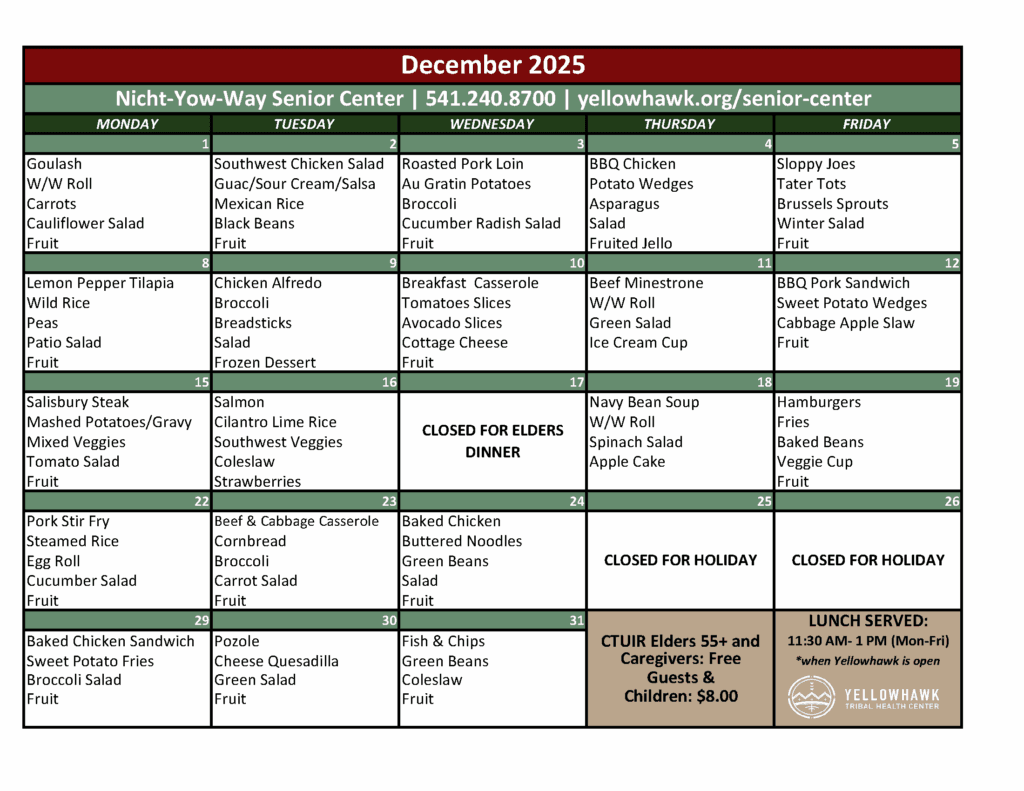 Any federally recognized Tribal member 55+ and Caregivers eat for free, all guest meals – $8